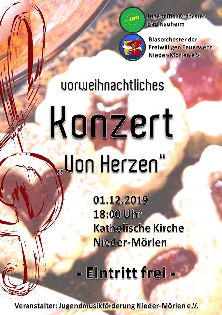 Am 01. Dezember 2019 um 18:00 Uhr lädt die Jugendmusikförderung Nieder-Mörlen e.V. herzlich zum diesjährigen vorweihnachtlichen Konzert in die katholischen Kirche Maria Himmelfahrt ein. Das JugendBlasOrchester Bad Nauheim und das Blasorchester der Freiwilligen Feuerwehr Nieder-Mörlen e.V. mit ihren Dirigenten Detlef Breitenbach und Sebastian Witzel freuen sich, die Besucher auf die beginnende Adventszeit einzustimmen. Mit dem diesjährigen Titel "Von Herzen" dürfen sich die Besucher auf ein harmonisches und abwechslungsreiches Programm zwischen Einfühlsamkeit und freudig pochender Impulsivität freuen. Der Einlass beginnt ab 17:30 Uhr, der Eintritt ist frei.